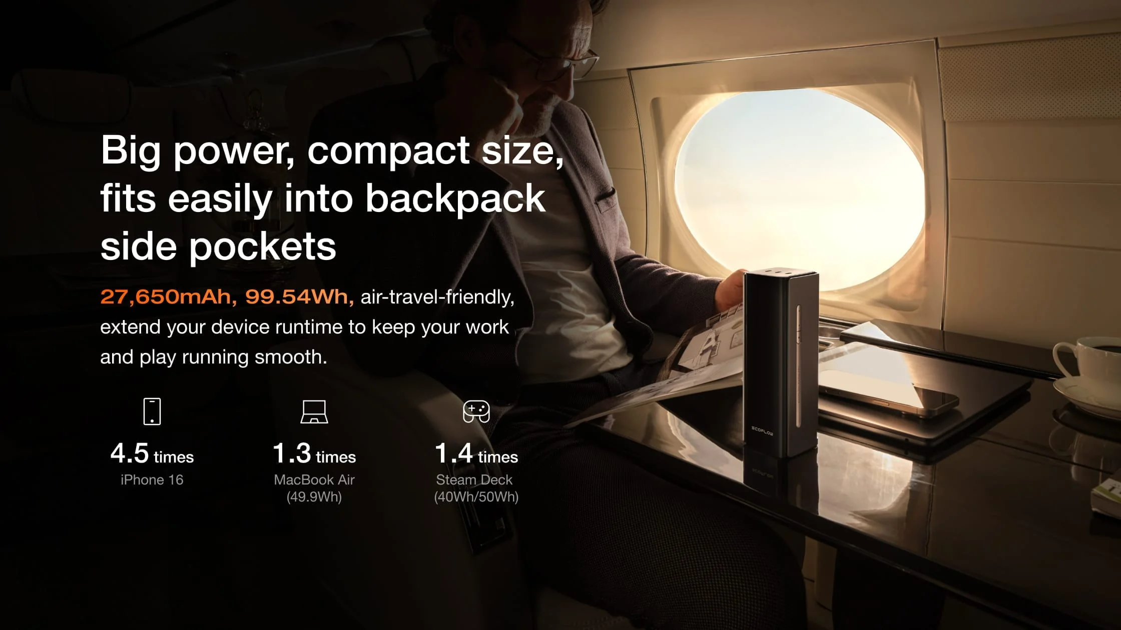 Big power meets portability — with 27,650mAh and 99.54Wh capacity, this air-travel-friendly charger keeps your devices running smoothly and fits easily into backpack side pockets.