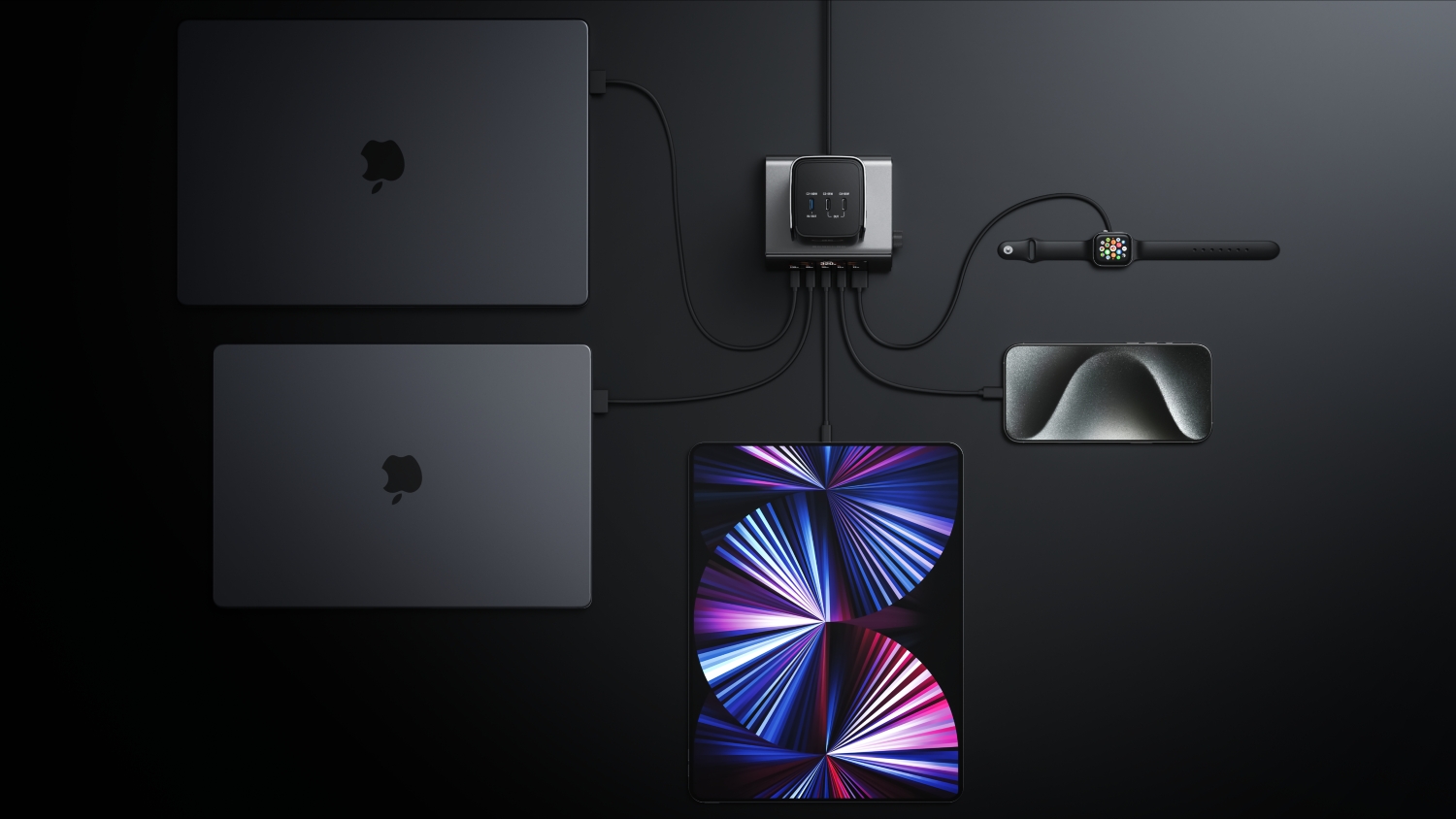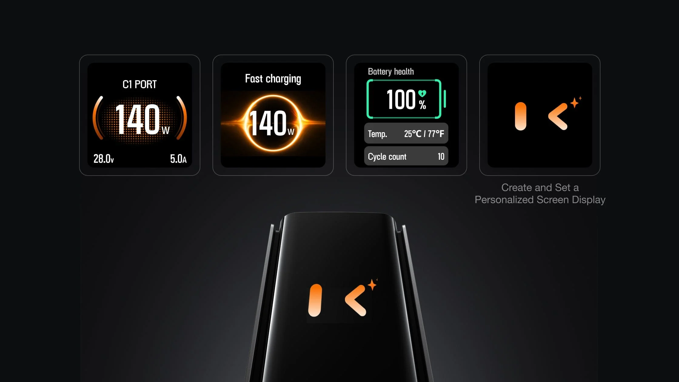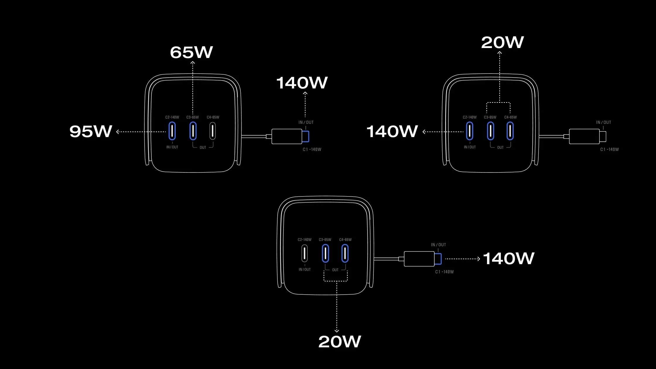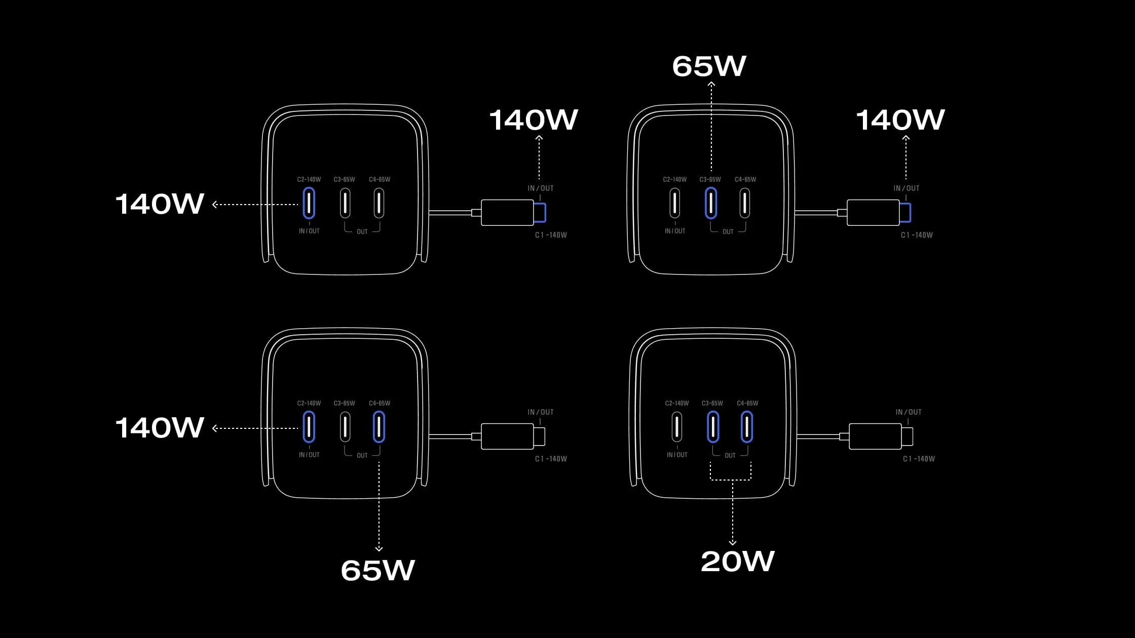 Charge up to four devices simultaneously with fast speeds, offering up to 300W total output and 140W single-port output.